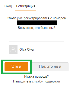 Сайт покажет информацию о том, что телефон уже привязан к определенному аккаунту. Вы увидите имя и фамилию, которую указывали при регистрации. Здесь нужно нажать на кнопку «Это я».
