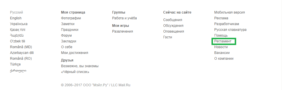 Если же Вы твердо решили избавиться от своего аккаунта, есть простой способ добиться этого результата. Интерфейс ресурса достаточно прост и понятен большинству пользователей. Однако поиск способа удаления профиля зачастую занимает немало времени. Дело в том, что разработчики удачно «спрятали» эту опцию. Путь к ней находится в самом низу страницы. Пролистав её до конца, найдите пункт «Регламент».