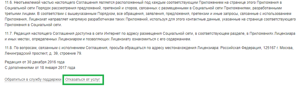 Перед Вами откроется пользовательское соглашение, которое описывает права и обязанности сторон, посетивших сайт. Пролистайте эту информацию до самого низа. Там Вы увидите активную кнопку «Отказаться от услуг». Она приведет Вас к удалению профиля.