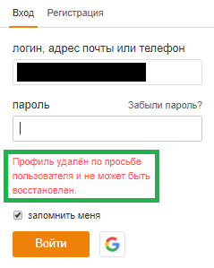 Теперь, если Вы попробуете зайти на сайт по своему логину и паролю, он будет выдавать информацию о том, что аккаунт удален по Вашей просьбе.
