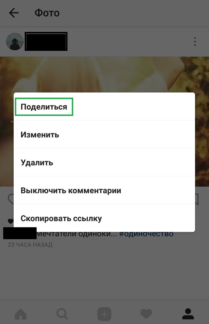 Нажав на кнопку, выберите в нем вариант «Поделиться».